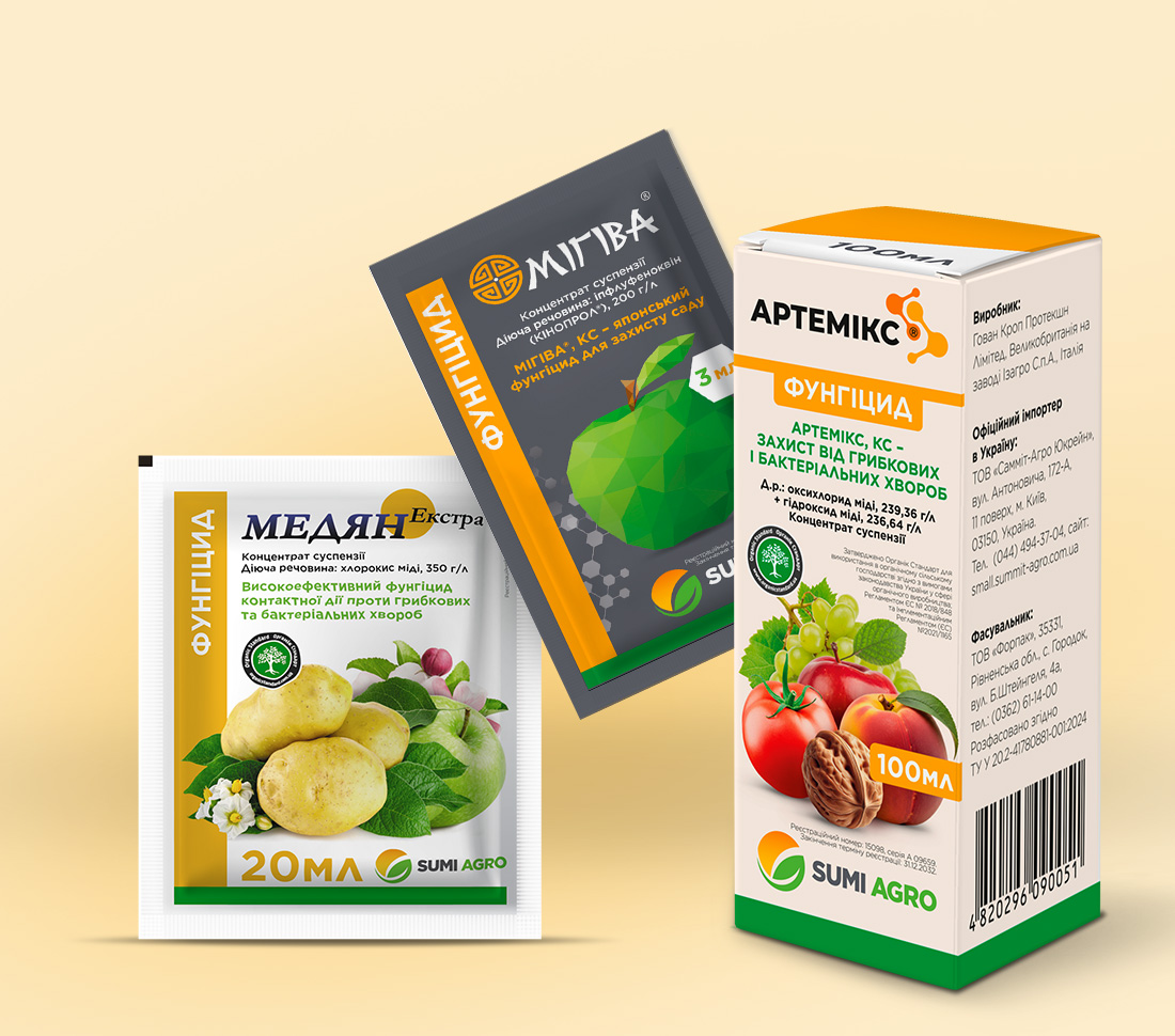 Для тих, хто займається вирощуванням плодово-овочевої продукції на своїх присадибних та фермерських ділянках ми пропонуємо 18 у фермерському та 16 препаратів у дрібному фасуванні для захисту рослин, в тому числі 5 біопрепаратів. Зручне пакування, перевірені роками якість та ефективність допомагають якнайкраще захищати й піклуватися про сади та городи України.